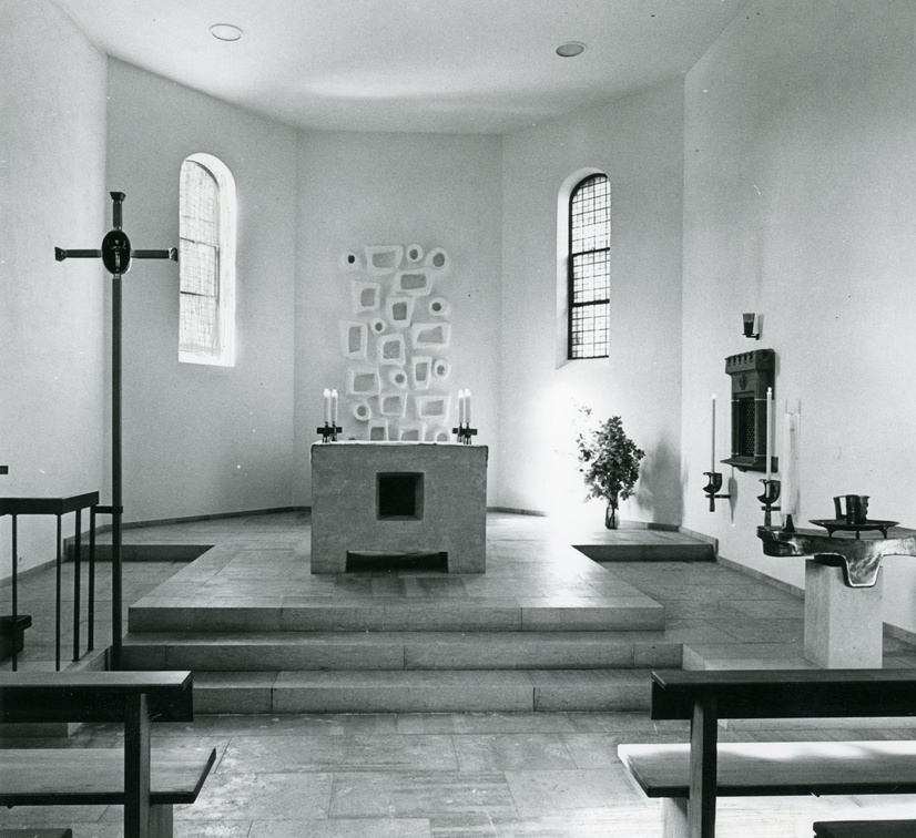 Wenn bei solchen Lösungen auch die entscheidende Gestaltung beim Architekten liegt und es scheinbar kaum ersichtlich ist, was der Bildhauer beitragen kann, so wäre es doch schade, auf seine Mitarbeit verzichten zu wollen; verfügt er doch über viel differenziertere Mittel, wohl zur Intensivierung eines Volumens wie zur Sensibilisierung des Raumes. Es sind dies Qualitäten, die dem Menschen seine eigene Körperlichkeit intensiver fühlbar machen und damit auch das Erlebnis des Hinein- und Hindurchgehens. Hindurchgehen vom Gehetztwerden zur Geborgenheit, vom Lärm in die Stille, von der Zerstreuung in die Sammlung, Übergänge, die vom Künstler einen Verzicht auf alles Demonstrative oder gar Monumentale voraussetzen. Wir haben uns leider daran gewöhnt, nur das Aussergewöhnliche, das zum Notwendigen noch Hinzugefügte als Kunst zu betrachten, also gerade das, worauf wir in unserer engen Situation der stets wachsenden Diaspora verzichten könnten oder oft müssten. Aber gerade dieser Umstand ist geeignet, ins Gebiet der wirklichen Kunst vorzustossen, in jene gestalterischen Bereiche, wo wir nicht mehr mit dekorativen Mitteln eine Situation zu übersteigern versuchen, sondern mit den primärsten Mitteln den Räumen und Situationen die grösstmögliche Dinglichkeit verleihen. Damit lassen wir jene herkömmliche sogenannte Kirchenkunst weit hinter uns und finden den Weg zu dem, was wir vielleicht erst später als wirkliche Kunst erleben.