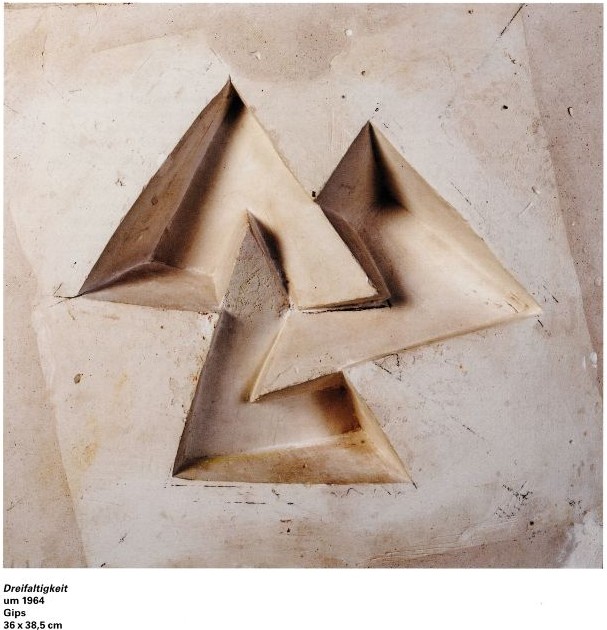 Die Kunst des alten Ägypten war für Albert Schilling immer Inspiration, Referenz und Massstab des eigenen künstlerischen Tuns. In der Ruine des koptischen Simeonsklosters bei Assuan stiess der Bildhauer zudem auf drei schwarze ineinandergreifende Dreiecke an einer gekalkten Wand. Die schlichte Umsetzung des Symbols für die Trinität beeindruckte ihn nachhaltig. Zum Stiftungsbestand gehört daher auch eine reliefartige Variation. Auch über der Kathedra des Würzburger Domes versuchte er knapp ein Jahrzehnt später eine bildhauerische Umsetzung.