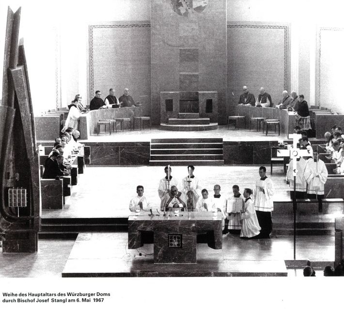 Die Gestaltung des Dominneren hatte in den Jahren zuvor die Gemüter heftig bewegt, unterschiedliche Meinungen trafen dabei immer wieder aufeinander und sorgten für Konfliktpotenzial, das auch in der deutschen Presse seinen Niederschlag gefunden hatte. Albert Schilling übernahm hier also keine leichte Aufgabe, war aber bis zu jenem Zeitpunkt nicht in die Diskussionen verwickelt gewesen. Er konnte somit ohne Vorbelastung an den Gesprächen zur Gestaltung von Vierung und Chor teilnehmen. Bis zum November 1963 waren die grundlegende Gestaltungsfragen – wohl auch durch das Zutun Albert Schillings – geklärt und konnten Bischof Stangl, der zum Konzil in Rom weilte, mitgeteilt werden. Die Position des Altares wie auch die des Sakramentshauses waren Fragen, die kontrovers diskutiert wurden. Diözesanbaumeister Hans Schädel wollte den Altar an zentraler Stelle der Vierung platzieren, hier war er sicherlich mit dem Bildhauer einer Meinung. Das Sakramentshaus allerdings sollte nicht im Altarbereich aufgestellt werden. Schädel sah hierfür die südliche Querhaus-Apside, das Peter- und Pauls-Chörlein, vor. Offensichtlich vertrat Albert Schilling die eigene Position mit solcher Überzeugungskraft, dass seine Vorstellungen zur Umsetzung kamen. Auch bei der Frage des Fussbodens war die Meinung des Künstlers schlussendlich ausschlaggebend. Schilling plädierte für einen einheitlichen Bodenbelag, der die Domkirche nicht mehr in eine Kirche der Geistlichkeit und einen Bereich der Laien separierte. Zum ersten Mal in seiner Geschichte wurde der monumentale Raum nun als Einheit verstanden. Neben theologisch-liturgischen Erwägungen hat den Künstler sicherlich auch die Vorstellung von der Schaffung eines Gesamtkunstwerkes geleitet. Am 1. April 1966 wurde daher die Entscheidung für den schwarzen Lahnmarmor auch als Bodenbelag getroffen.
