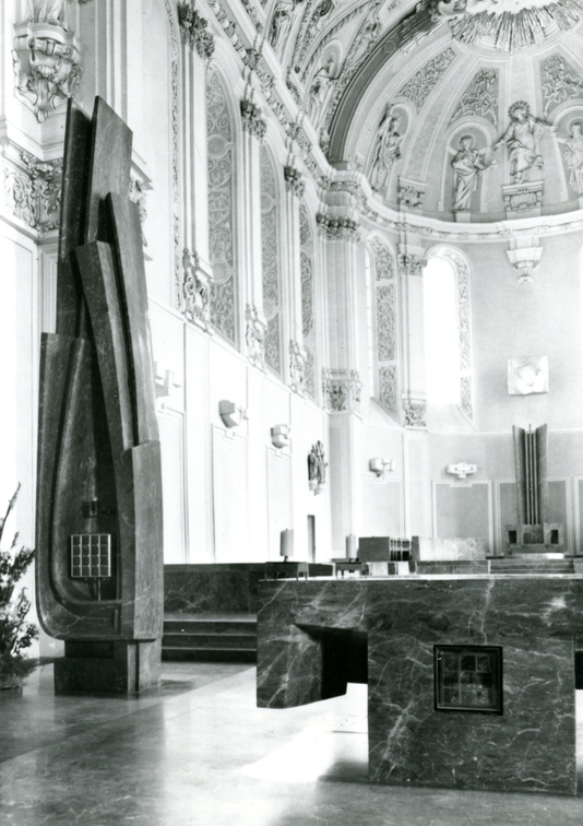 In den Jahren zwischen 1963 und 1966 konkretisierte Albert Schilling in Absprache mit den Auftraggebern die Ausführung des Altar- und Chorbereiches. Er sah den Altar als „verdichtetes Raumzentrum“, das er aus dem Motiv des Kubus heraus entwickelte und diesem so Wucht und Präsenz gab. Die in Blei gegossenen Altarmodelle im Massstab 1:10 machen diesen Prozess nachvollziehbar. Sie sind jedoch überdies als eigenständige Kunstwerke anzusehen: Block und Tischform verschmelzen hier ineinander. Das Sakramentshaus diente ihm ebenso wie Altar, Ambo und Kathedra samt Chorgestühl als eine Möglichkeit, die Massen im Raum zu organisieren und so den Raum als Kunstwerk zu prägen. Nachdem das Sakramentshaus im November 1966 aufgestellt wurde, reagierte sofort die örtliche Presse. Am 23. November wurde dessen Gestalt massiv kritisiert. Der Autor meinte dazu: „Das Ganze scheint den Willen des Bildhauers zu bekunden, mit der Marmorsäule den romanischen Raum und dessen bauliche Gliederung zu beherrschen, offenbar gegen das Vorhandene anzugehen.“ In einem Artikel vom Heiligen Abend wurde dem jedoch die künstlerische Motivation Albert Schillings entgegengestellt: „… entschloss ich mich, diesen Barock in seiner Banalität als eine sauberlackierte Hülle zu bejahen und im Tragen den Weg der Antithese als künstlerische Spannung zu beschreiten, da mir nur diese Lösung die Möglichkeit bot, den stilistischen Bruch am Chorbogen zwischen Romanik und Barock zu überbrücken.“ Das seit der letzten Renovierung des Domes 2011/12 wieder dem Ambo zugeordnete Vortragekreuz war das Ergebnis längeren Ringens. Es wurde erst im Spätjahr 1966 in Auftrag gegeben. Das mit vergoldetem Bronzeblech überzogene Holzkreuz setzt einen kraftvollen Akzent im Chor und nimmt die Monumentalität der anderen Stücke auf.