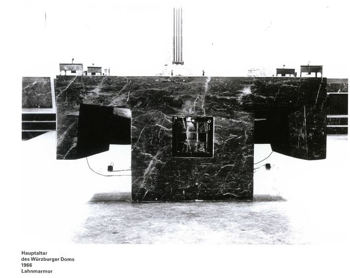 Schon drei Jahre nach der Altarweihe des Domes befriedigte die Gestaltung der Wände im Hochchor, die mit Teppichen geschmückt waren, nicht mehr. Vor allem jener hinter der Kathedra, der die Gestaltung der Decke des Langhauses aufnahm, galt als farblich zu schwach. Man einigte sich daher 1970 darauf, die Kathedra mit einer Buckwand aus schwarzem Marmor zu hinterfangen. Albert Schilling, der offensichtlich mittlerweile das Vertrauen von Bischof und Domkapitel genoss, wurde hiermit beauftragt.